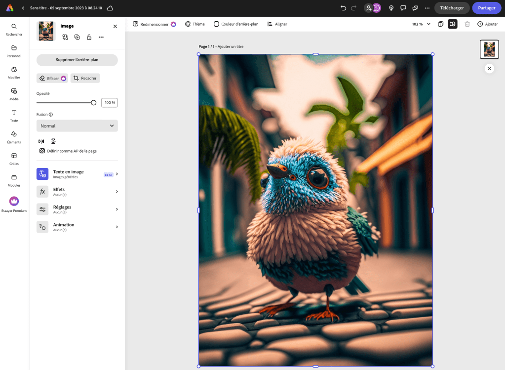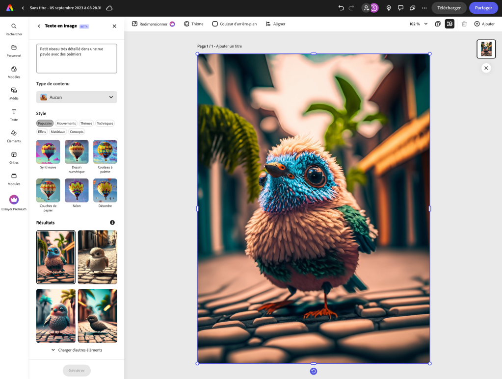 Par exemple pour obtenir l’image ci-dessous il a été demandé par écrit : petit oiseau très détaillé dans une rue pavée avec des palmiers.